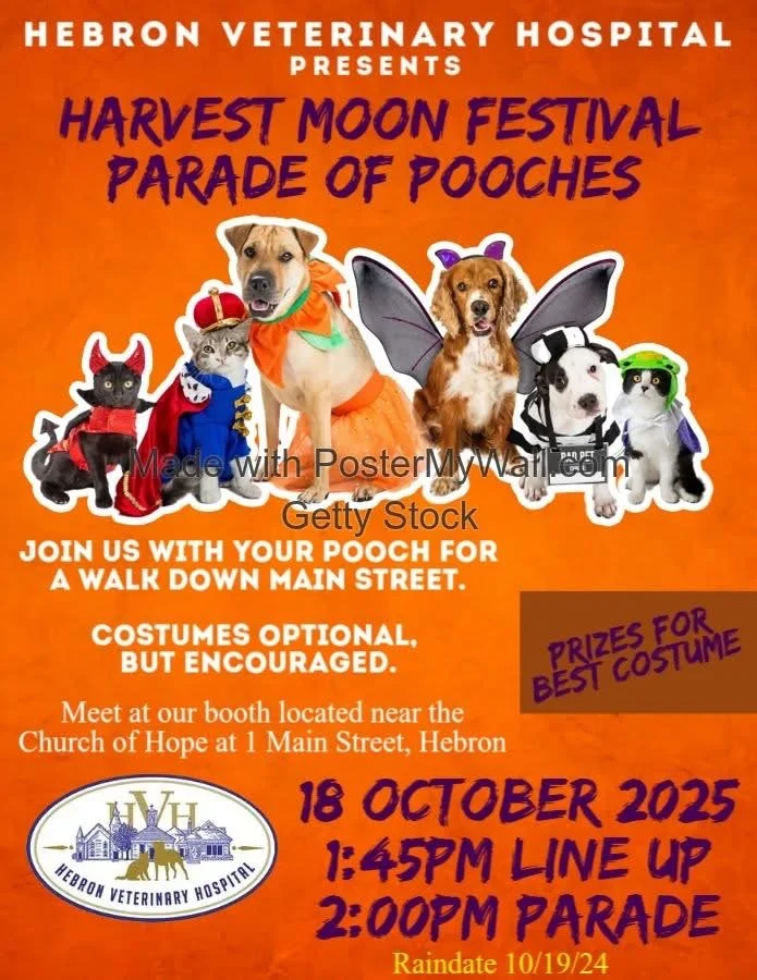 Join us with your pooch for a walk down Main Street! Presented by Hebron Veterinary Hospital. Meet at our booth by The Church of Hope by 1:45 pm. There will be prizes!